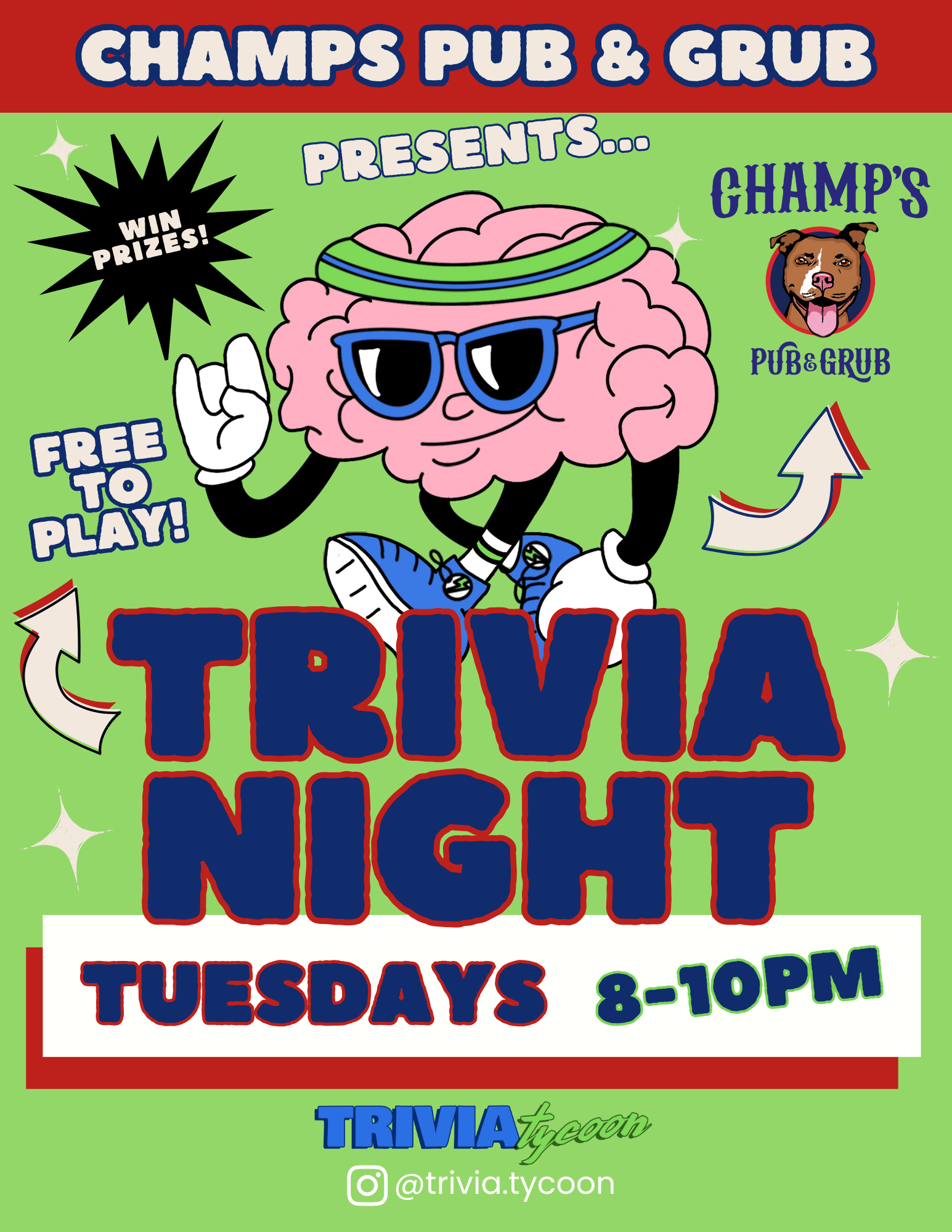 Jan 27, 2026 8:00 PM (PST) → Jan 27, 2026 10:00 PM (PST) | Tue, Jan 27 • 8:00 PM–10:00 PM | Trivia night at Champs Pub & Grub with Trivia Tycoon. | Burbank | Free to play! | 4103 W Burbank Blvd, Burbank, CA 91505 | casey@triviatycoon.com | Champs Pub & Grub is kicking off their Tuesday trivia nights with Trivia Tycoon on January 27th! Trivia starts at 8pm & it's free to play!! Bring your friends - team sizes cap at 8 people! Eat, drink, have fun and maybe win prizes! | Jan 20, 2026 1:15 AM | ||||||