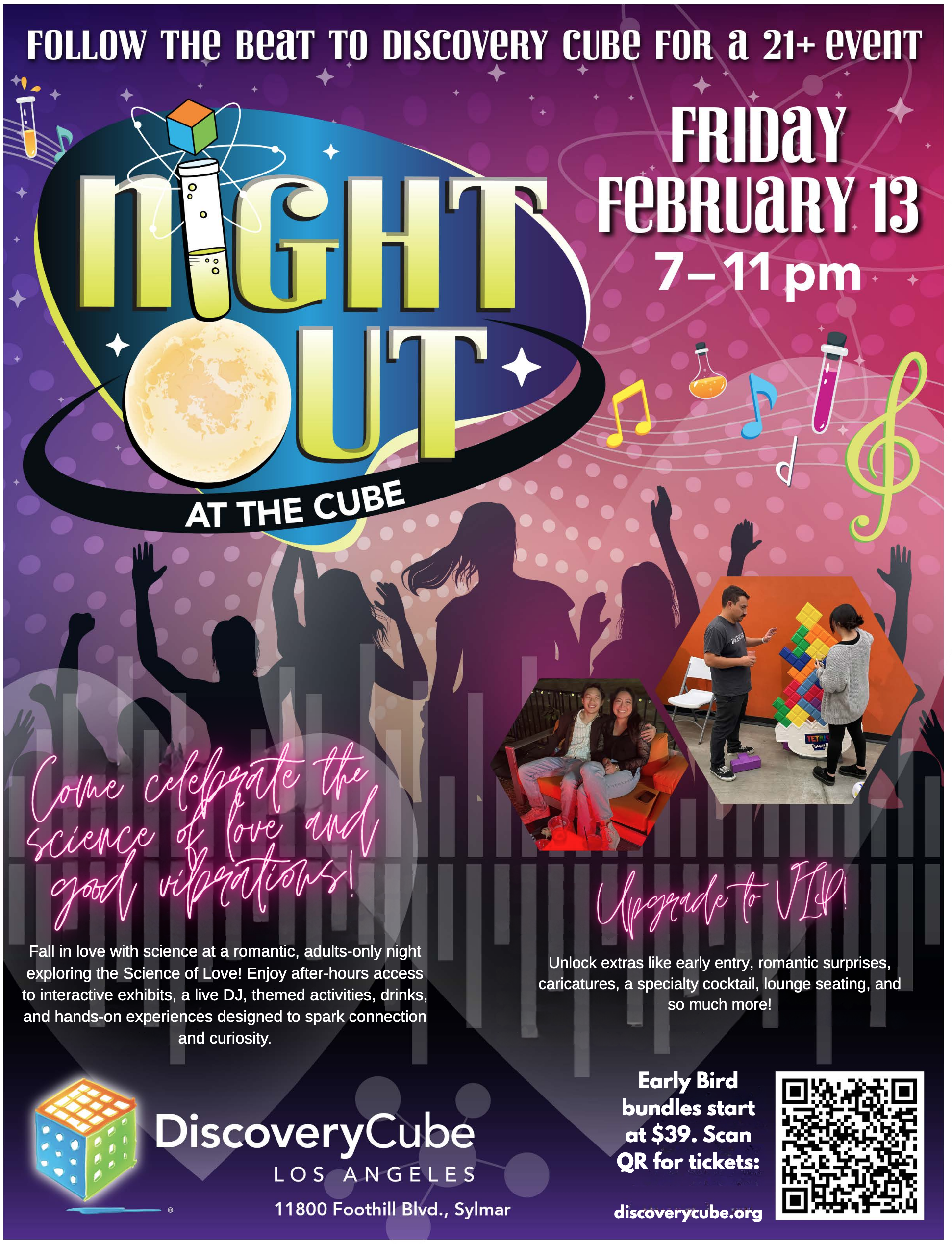 Feb 13, 2026 7:00 PM (PST) → Feb 13, 2026 11:00 PM (PST) | Fri, Feb 13 • 7:00 PM–11:00 PM | Valentine's celebration with science, music, and dancing. | Sylmar | GA starting at $45 and VIP starting at $85 | 11800 Foothill Blvd. Sylmar, CA 91342 | erwin.kora@gmail.com | 💖 Valentine’s Night Out at the Cube Friday, February 13 | 7 PM – 11 PM | Ages 21+ Get ready for a night of science, music, and unforgettable fun — because Valentine’s Night Out at the Cube is for everyone! Whether you’re celebrating with friends, flying solo, or enjoying a date night, this evening is all about good vibes, great company, and dancing the night away. ✨ Enjoy after-hours access to Discovery Cube Los Angeles, with interactive exhibits, games, and hands-on science fun. 🎶 Hit the dance floor as our live DJ spins your favorite tracks, plus enjoy Latin music classes throughout the night — learn to move to the rhythms of salsa, bachata, and merengue! 🍕 Grab a bite from the Cube Café and sip on beer, wine, or specialty cocktails available for purchase. 💘 Take on our Sweetheart Science Challenge, follow clues around the Cube, and earn a fun prize. Whether it’s a night out with your crew or your special someone, Valentine’s Night Out at the Cube is your chance to mix science with a whole lot of celebration. ❤️ | Jan 6, 2026 9:36 PM | ||||||