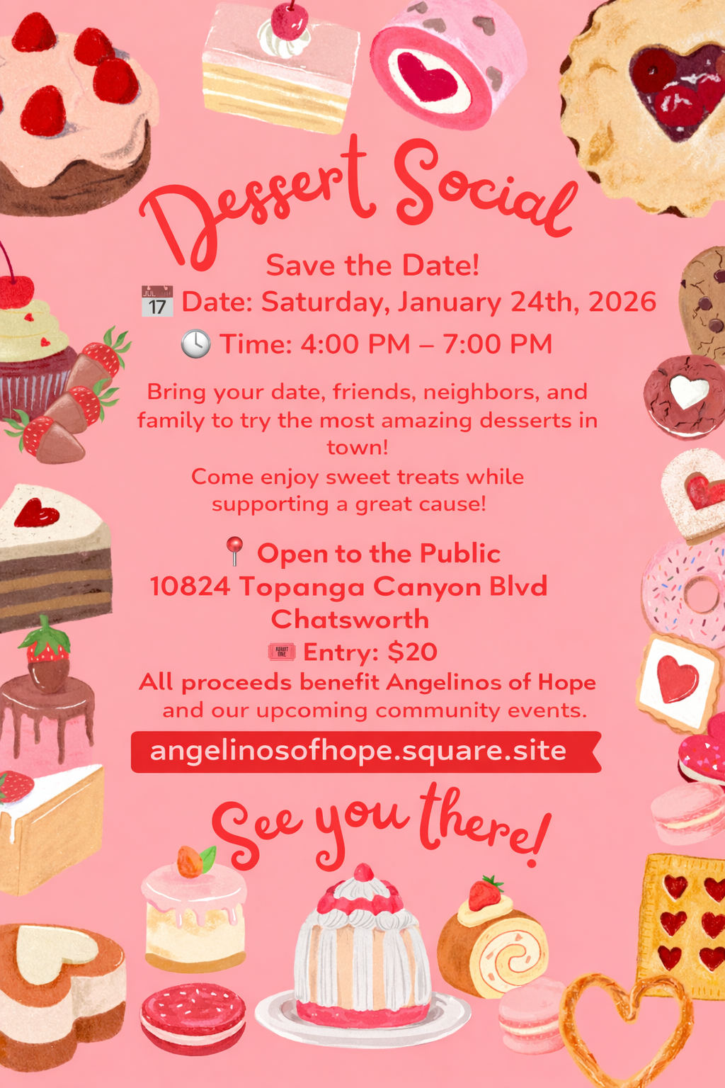 Jan 24, 2026 4:00 PM (PST) → Jan 24, 2026 7:00 PM (PST) | Sat, Jan 24 • 4:00 PM–7:00 PM | Dessert social fundraiser for community support. | Northridge | $20 | 10824 Topanga Canyon Blvd Chatsworth Ca 91311 | angelinosofhope@gmail.com | 🍰 Dessert Social — Save the Date! 🍰 Join us for a sweet evening of indulgence and community at our Dessert Social! Bring your date, friends, neighbors, and family to enjoy the most delicious desserts in town—all while supporting a great cause. 📅 Saturday, January 24, 2026 ⏰ 4:00 PM – 7:00 PM 📍 10824 Topanga Canyon Blvd, Chatsworth 🎟 Entry: $20 🌟 Open to the Public All proceeds benefit Angelinos of Hope and our upcoming community events. 🍰 Want to Donate Sweet Treats? If you would like to donate desserts for the event, please message us. Your sweet contribution will help make the Dessert Social even more special! Tickets available now at 👉 https://lnkd.in/geXWREFN ✨ See you there! ✨ | Jan 10, 2026 2:22 AM | ||||||