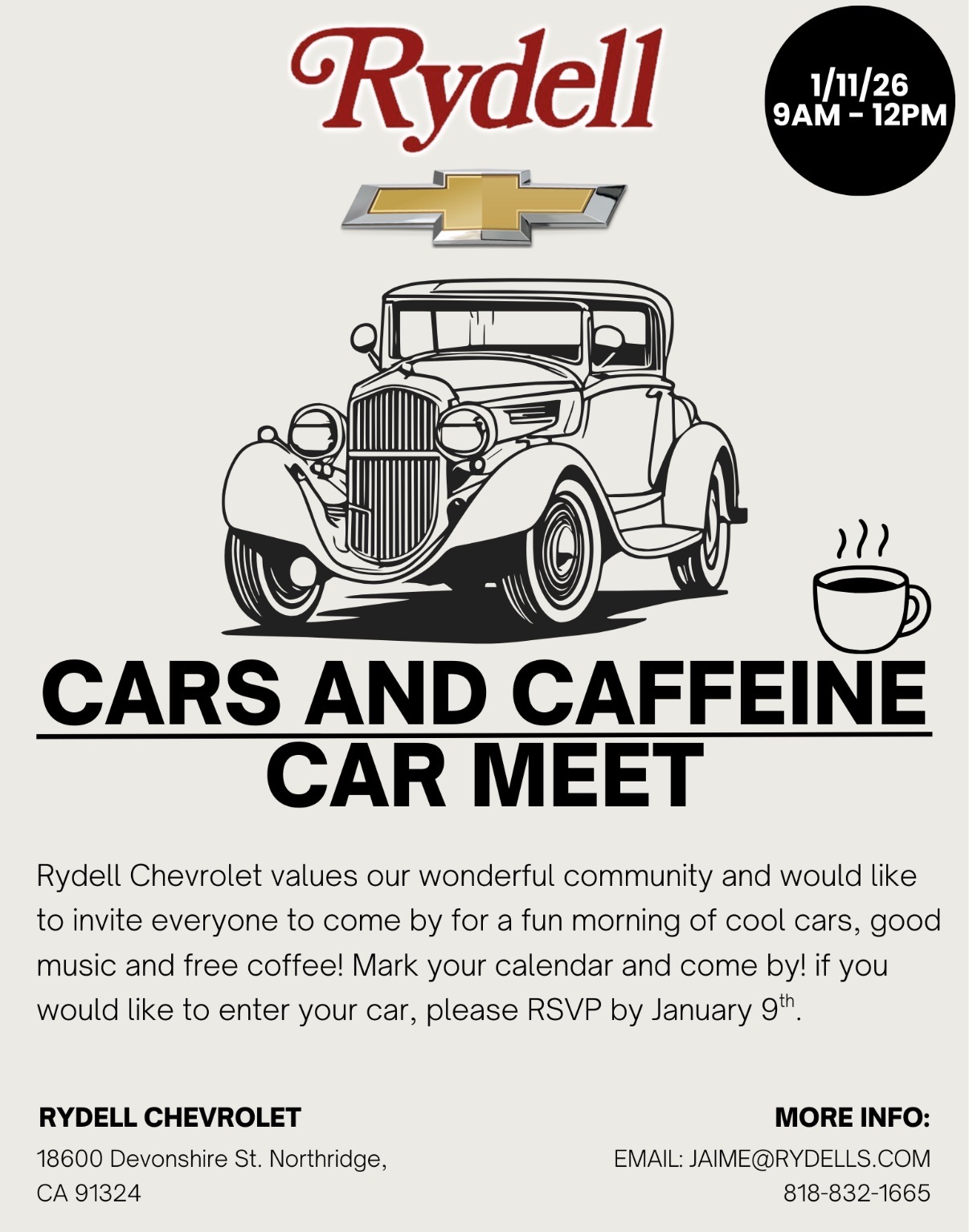 Jan 11, 2026 9:00 AM (PST) → Jan 11, 2026 12:00 PM (PST) | Enjoy cool cars, music, free coffee, and bagels. | Northridge | Free! | 18600 DEVONSHIRE ST, NORTHRIDGE CA 91324 | Jaime@Rydells.Com | Free event. Come enjoy some really cool cars, music,with free coffee and bagels. | Jan 9, 2026 10:11 AM | |||||||
