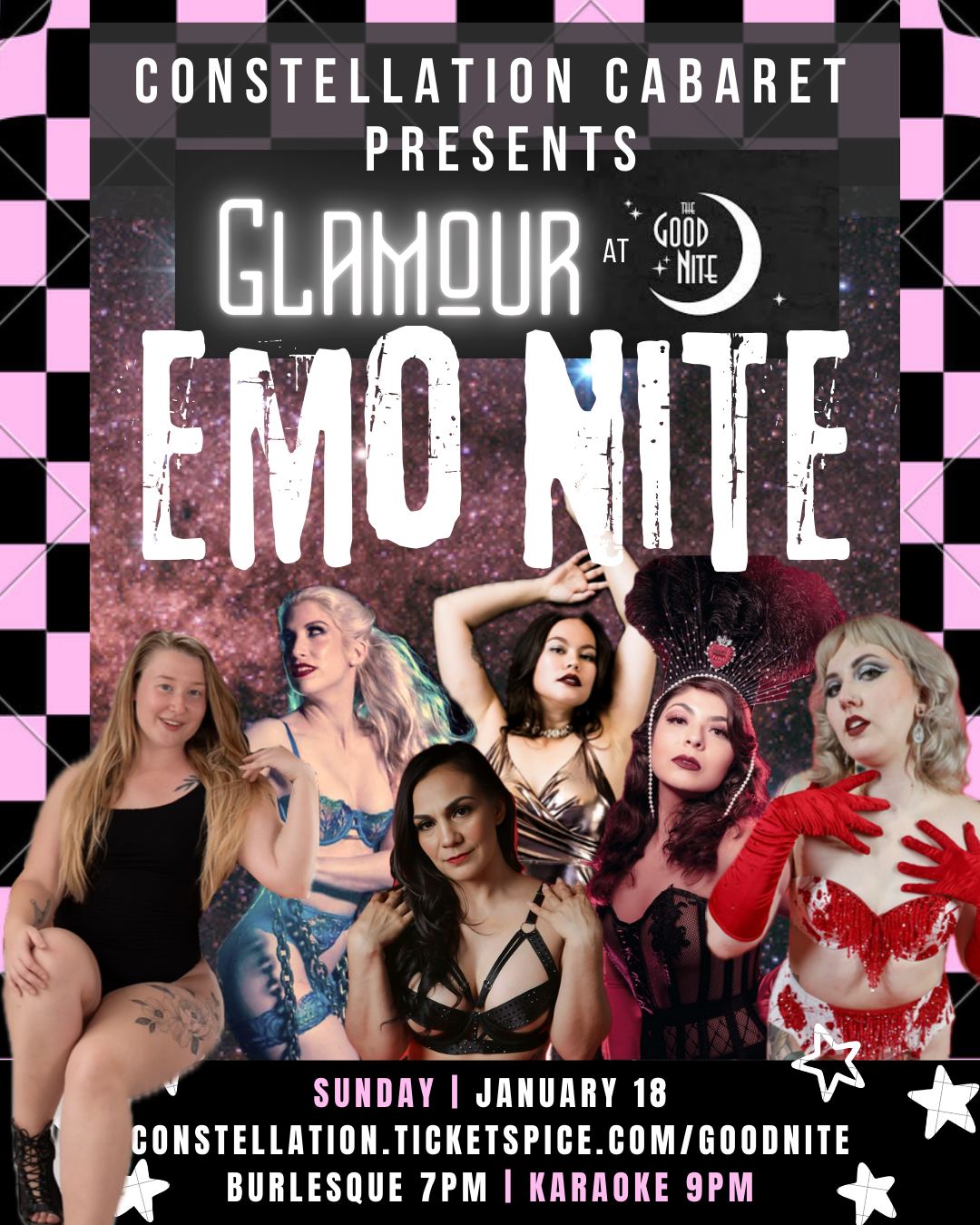 Jan 18, 2026 7:00 PM (PST) → Jan 18, 2026 11:00 PM (PST) | Sun, Jan 18 • 7:00 PM–11:00 PM | Burlesque show with karaoke to emo music. | Burbank | $10 | 10721 Burbank Blvd, North Hollywood | constellation.cabaret@gmail.com | Burlesque show to emo and pop-punk music at The Good Nite in NoHo! Burlesque at 7pm, karaoke at 9pm | Jan 16, 2026 7:22 PM | ||||||