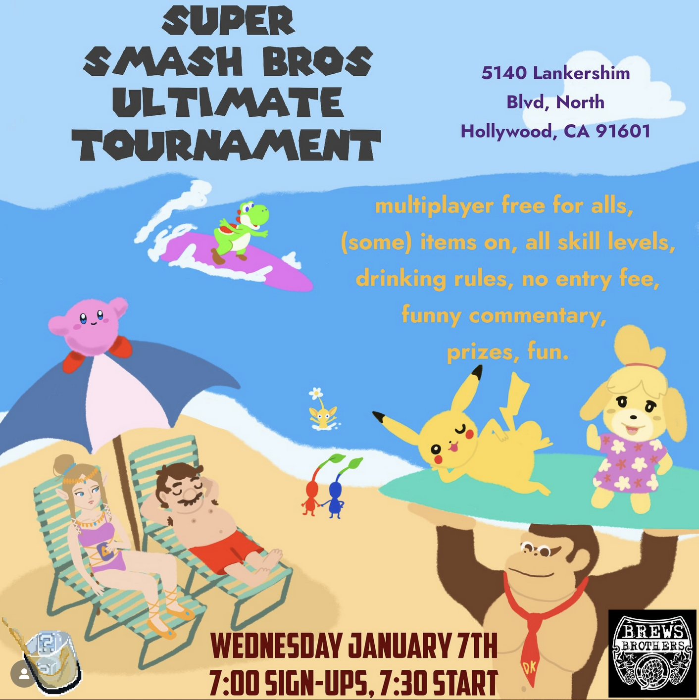 Jan 7, 2026 7:00 PM (PST) | Casual Super Smash Bros Ultimate tournament with comedy and drinks. | North Hollywood | Free | Brews Brothers 5140 Lankershim Ave | LA! Wednesday 1/7. Casual Super Smash Bros Ultimate Tourney 🎮 at Brews Brothers North Hollywood 🍻 (@brewsbrotherscraftbeer )!#Wednesday, January 7th), 7:30PM, #Free! 5140 Lankershim Ave. 🌴 Details below!Description: Every first Wednesday of the month, one part nerd, one part slurred, Super Trashed brings together comedy, Super Smash Bros Ultimate and alcohol at a super rad craft beer bar in North Hollywood. Join your hosts (and jokey commentators), Dan, Jesse B. and OJ, as every contestant virtually battles amongst themselves while physically battling distractions. Audience participation is essential as a live crowd chant, joke, and suggest new rules and new gags.This show is a casual “e-sports gone mild” tournament. Our competitors tend to skew towards beginners and moderate players but there’s no skill required to play. We aim to be a fun night for everyone, to keep the party in party game.Drinking rules apply! If you lose a stock, you’ll take a sip of your beverage. If you lose a stock on accident, take two sips. If you lose a stock via a Final Smash, take three sips. The winner will get $25 of their tab covered.Also, if you’re not good at video games, you can still win an #Amiibo (the Good Sports Amiibo) for the person who cheers the loudest, jeers the funniest, supports others, and has the best time.Tournament Format: A series of free for alls to determine a winners and losers brackets. Subsequent FFA and 1V1 rounds scheduled based on amount of players. Two loses in FFA or 1V1 to be eliminated. Items on (low), including everything except maxim tomato, heart container, fairy bottle, super star, hammer/golden hammer, gust bellows, special flag, boss galaga and lightning.7:00pm signup, 7:30 start. We’ll provide controllers but feel free to arrive early to pair your own.When: Wednesday January 7th, 2025. 7:00pm Sign-Ups, 7:30pm StartWhere: Brews Brothers, 5140 Lankershim Blvd, North Hollywood, CA 91601Cost: Free, no entry fee | Dec 31, 2025 5:57 AM |
