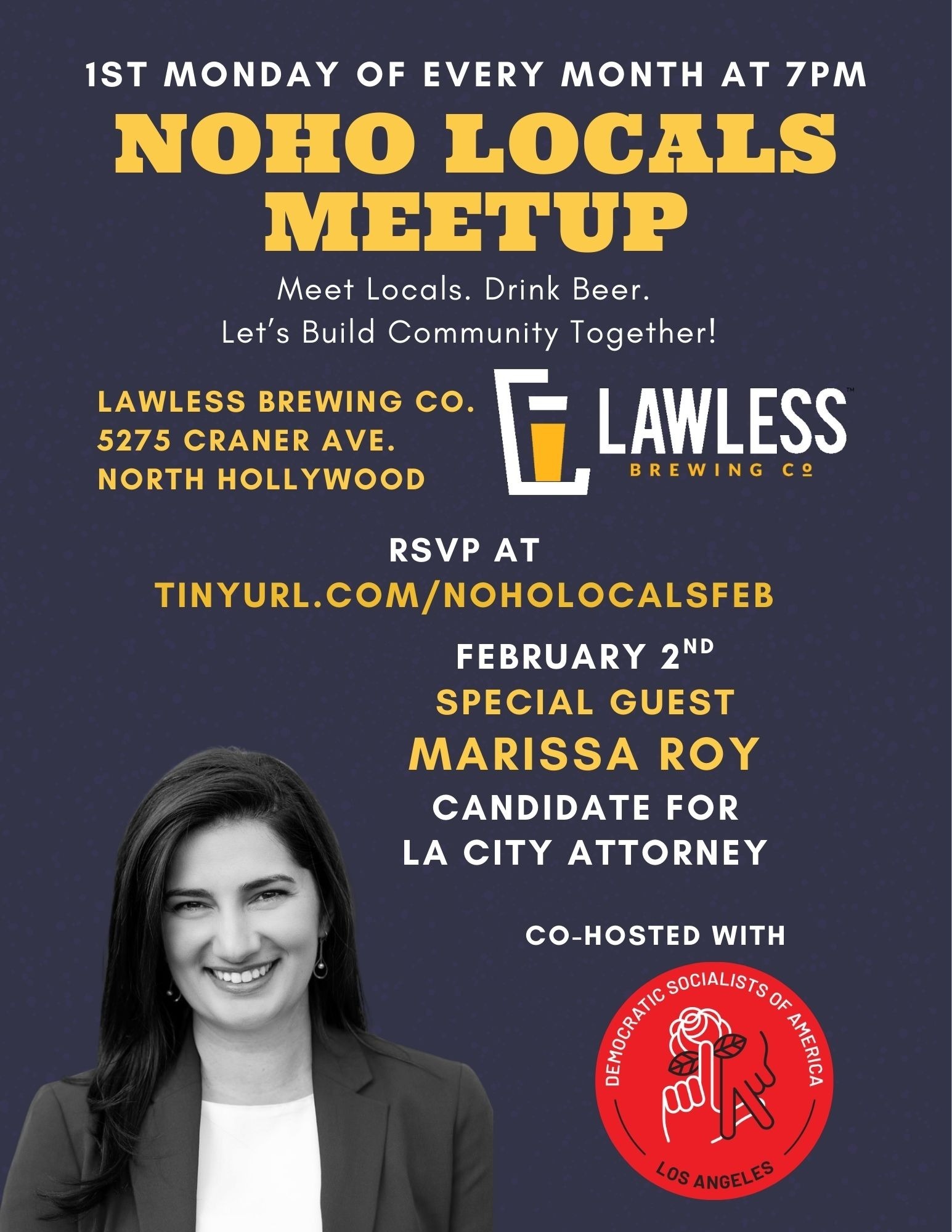 Jan 31, 2026 12:00 AM (PST) → Feb 2, 2026 7:00 PM (PST) | Sat, Jan 31 • 12:00 AM–7:00 PM | Sat, Jan 31, 2026 | Community meetup with guest Marissa Roy to discuss her campaign. | North Hollywood | Free! | 5275 Craner Ave. North Hollywood, CA 91601 | jillianburgos@gmail.com | Join us for the February NoHo Locals meet up! We gather the first Monday of every month to share a drink and build community. This month we have a special guest, Marissa Roy, who is running for Los Angeles City Attorney. Come meet Marissa and hear about her campaign and if you feel inspired, help us write some post cards to voters in support of her. 7pm at Lawless Brewing in NoHo. Short speaking program at 8pm. | Jan 31, 2026 7:35 PM | |||||