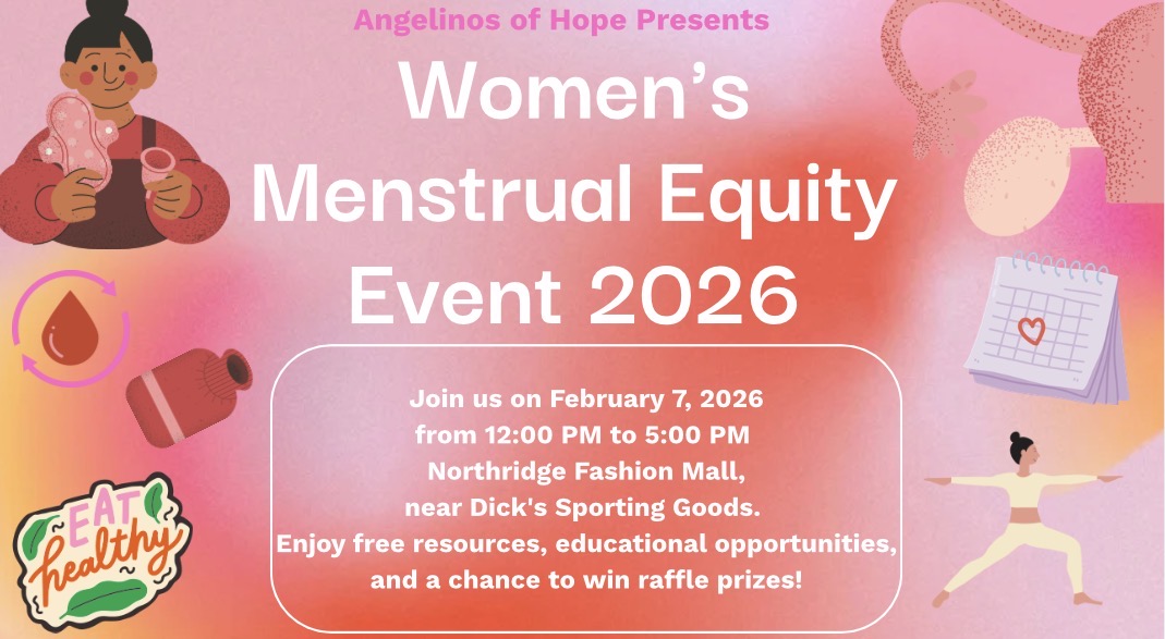 Feb 7, 2026 12:00 PM (PST) → Feb 7, 2026 5:00 PM (PST) | Sat, Feb 7 • 12:00 PM–5:00 PM | Empower women with free menstrual hygiene products and education. | Northridge | Free | Northridge Fashion CenterNorthridge Fashion Center, near Dick’s Sporting, Goods | angelinosofhope@gmail.com | YOU’RE INVITED!Empower Her Giveaway EventSaturday 2/7/2026 2025 | 12 PM – 5 PMNorthridge Fashion Mall – Northridge, CA Join us for a powerful day of community, care, and change as we come together to empower women and break the stigma surrounding menstruation. We invite you to come and meet our organization. We will be offering the following: * Free menstrual hygiene products (pads, tampons, liners, cups) * Feminine hygiene kits & wipes * Tote bags filled with care packages * Educational materials on menstrual and women’s health Why It Matters:Many underserved communities lack access to basic menstrual products. Stigma continues to threaten women’s health, dignity, and confidence. We’re changing that—one care package at a time. Come support, share, and uplift!Let’s break the stigma—together. Hosted by Angelinos of Hope | Jan 10, 2026 2:26 AM | ||||||