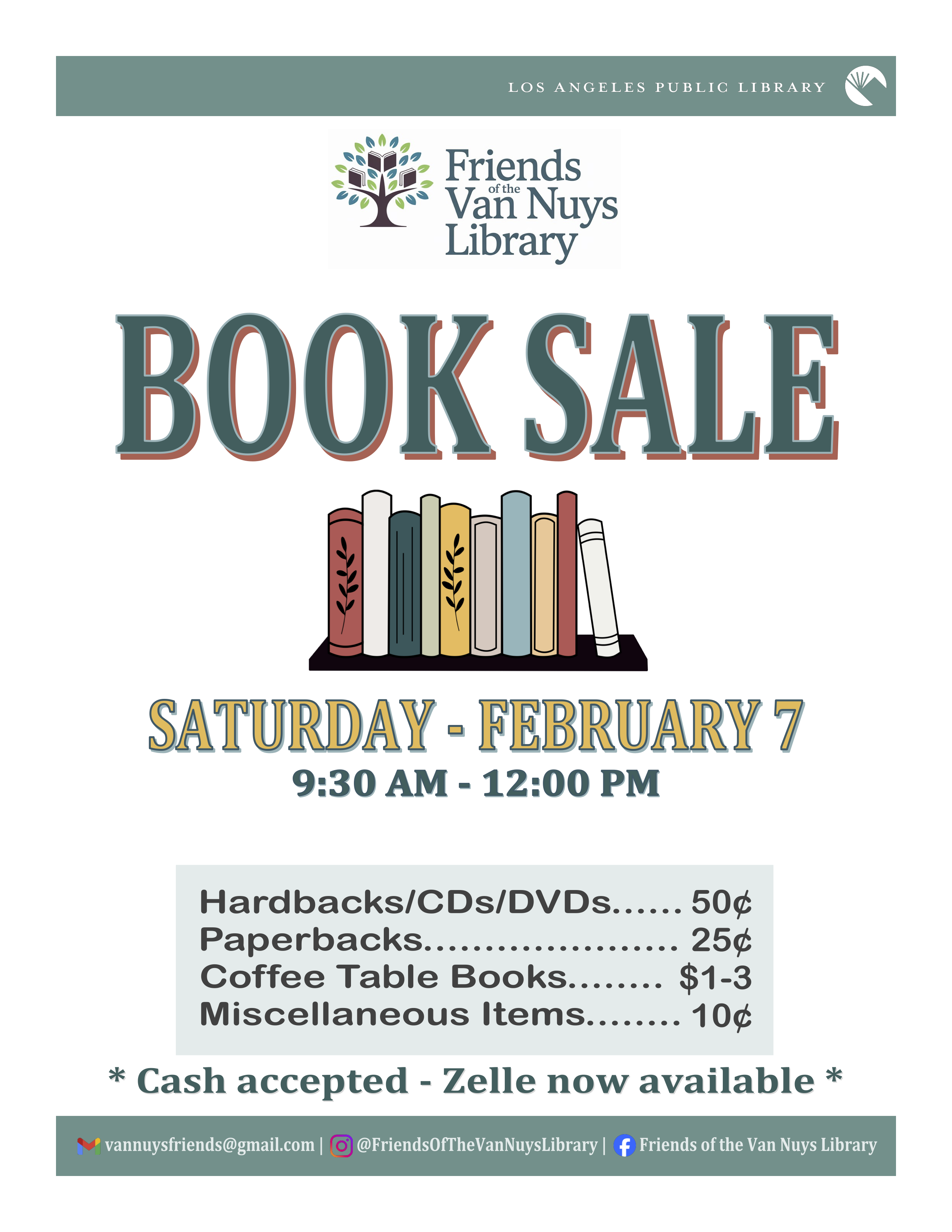 Feb 7, 2026 9:30 AM (PST) → Feb 7, 2026 12:00 PM (PST) | Sat, Feb 7 • 9:30 AM–12:00 PM | Sat, Feb 7, 2026 | Community book sale supporting library programs. | Van Nuys | 💥 Prices start at just 10 cents! ✔️ Paperbacks – $0.25 ✔️ Hardbacks – $0.50 ✔️ DVDs & CDs – $0.50 ✔️ Coffee table books – $1-$3 *Cash accepted | Zelle now available* | 6250 Sylmar Ave, Van Nuys, CA 91401 | yerisv045@gmail.com | 🗓️ Join us! Saturday, February 7 ⏰ 9:30 AM – 12 PM 📍 Van Nuys Public Library 6250 Sylmar Ave, Van Nuys, CA 91401 We have hundreds of new books added this month! 💥 Prices start at just 10 cents! ✔️ Paperbacks – $0.25 ✔️ Hardbacks – $0.50 ✔️ DVDs & CDs – $0.50 ✔️ Coffee table books – $1-$3 *Cash accepted | Zelle now available* ❤️ Every purchase helps support library programs for our community. | Jan 23, 2026 11:29 PM | |||||