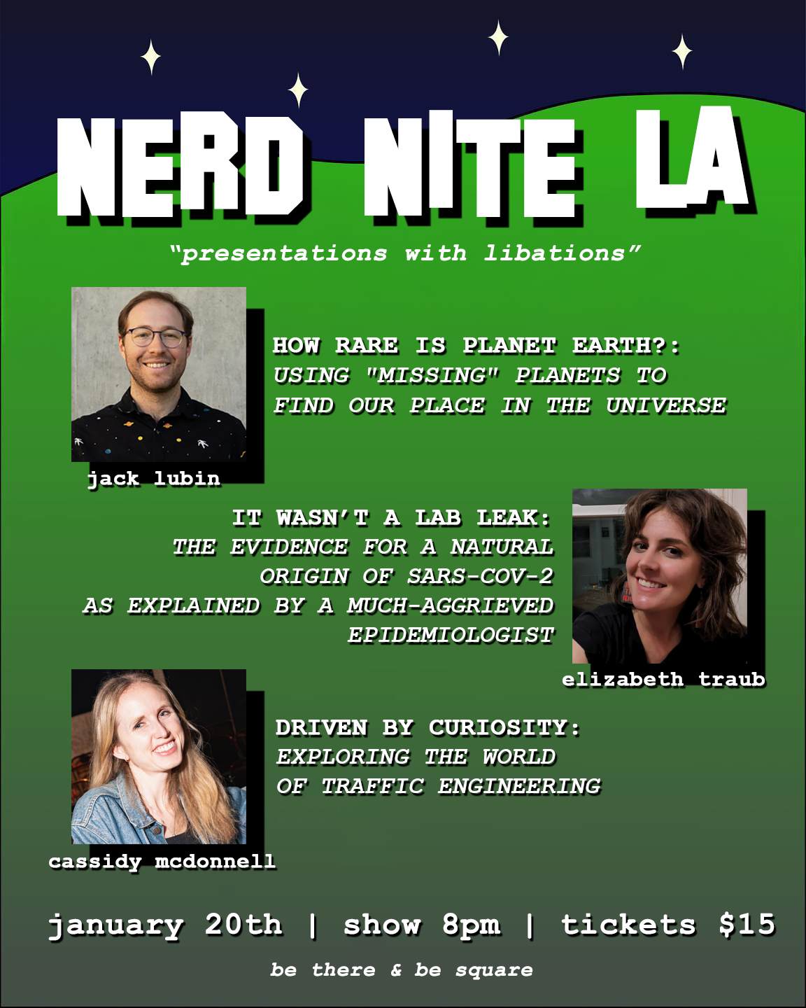 Jan 20, 2026 8:00 PM (PST) → Jan 20, 2026 10:30 PM (PST) | Tue, Jan 20 • 8:00 PM–10:30 PM | Informative presentations with drinks and fun atmosphere. | Glendale | $15 | Brewyard Beer Company (906 Western Ave, Glendale, CA 91201) | marymadbaldo@gmail.com | We all know that learning is more fun when you’re drinking with friends, colleagues, and fellow nerds. Thus, Nerd Nite is a monthly event held in more than 100 cities across the globe during which three passionate speakers give 20-minute fun-yet-informative presentations across all disciplines – while the audience drinks along. It’s like TED Talks…but with beer, tacos, music, and nerdy merch! | Jan 15, 2026 1:27 AM | ||||||
