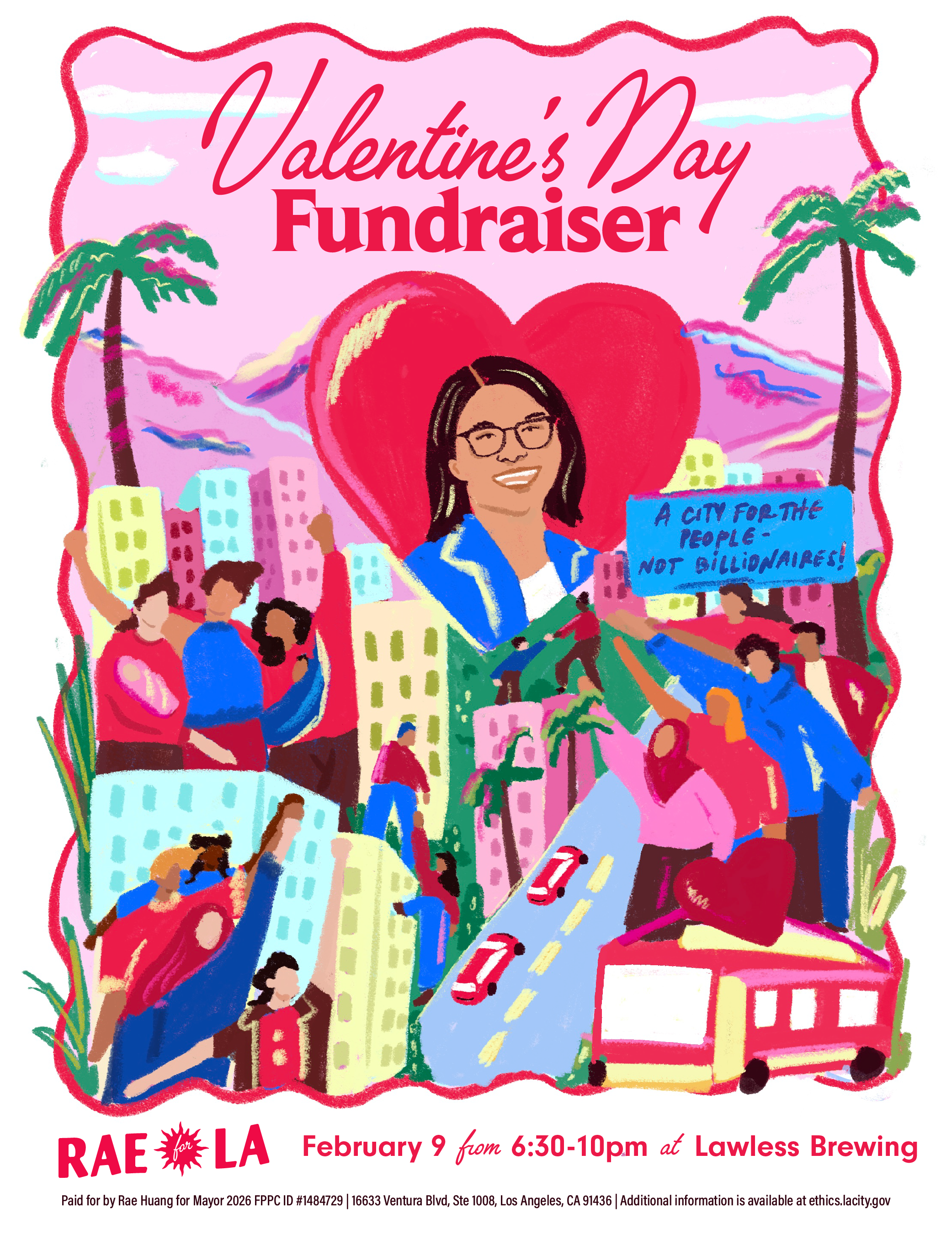 Feb 9, 2026 6:30 PM (PST) → Feb 9, 2026 10:00 PM (PST) | Mon, Feb 9 • 6:30 PM–10:00 PM | Mon, Feb 9, 2026 | Cozy Valentine’s Day fundraiser supporting Rae for LA campaign. | North Hollywood | $15 Donation | 5275 Craner Ave, North Hollywood, CA 91601 | jasoneright5@gmail.com | Join us for a cozy, creative Valentine’s Day fundraiser in support of the Rae for LA campaign 💖 We’re gathering at Lawless Brewing for a cozy night celebrating love for Los Angeles, shared community, and showing up for one another. We are also excited to announce that we will have our signature sheets with us this day to officially get Rae on the Ballot. We need 2000 signatures by 02/15 so lets kick start this launch with a BANG! | Feb 3, 2026 12:05 AM | |||||