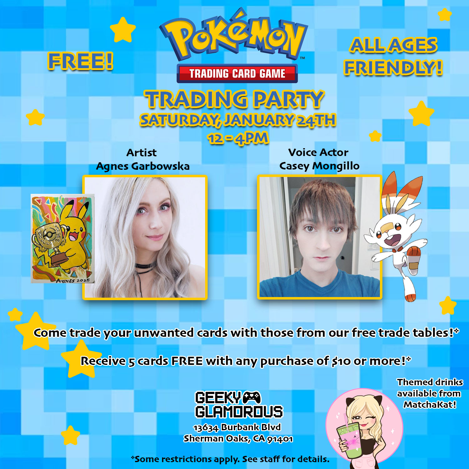 Jan 24, 2026 12:00 PM (PST) → Jan 24, 2026 4:00 PM (PST) | Sat, Jan 24 • 12:00 PM–4:00 PM | Trade Pokémon cards and meet special guests! | Sherman Oaks | Free | 13634 Burbank Blvd, Sherman Oaks, CA 91401 | mandie@geekyglamorous.com | Come trade your unwanted, official Pokémon cards for ones you do want from our free trade table! We'll also be joined by Pokémon voice actor, Casey Mongillo, Artist Agnes Garbowska, and themed drinks will be for sale from Matcha Kat! | Jan 13, 2026 8:29 PM | ||||||