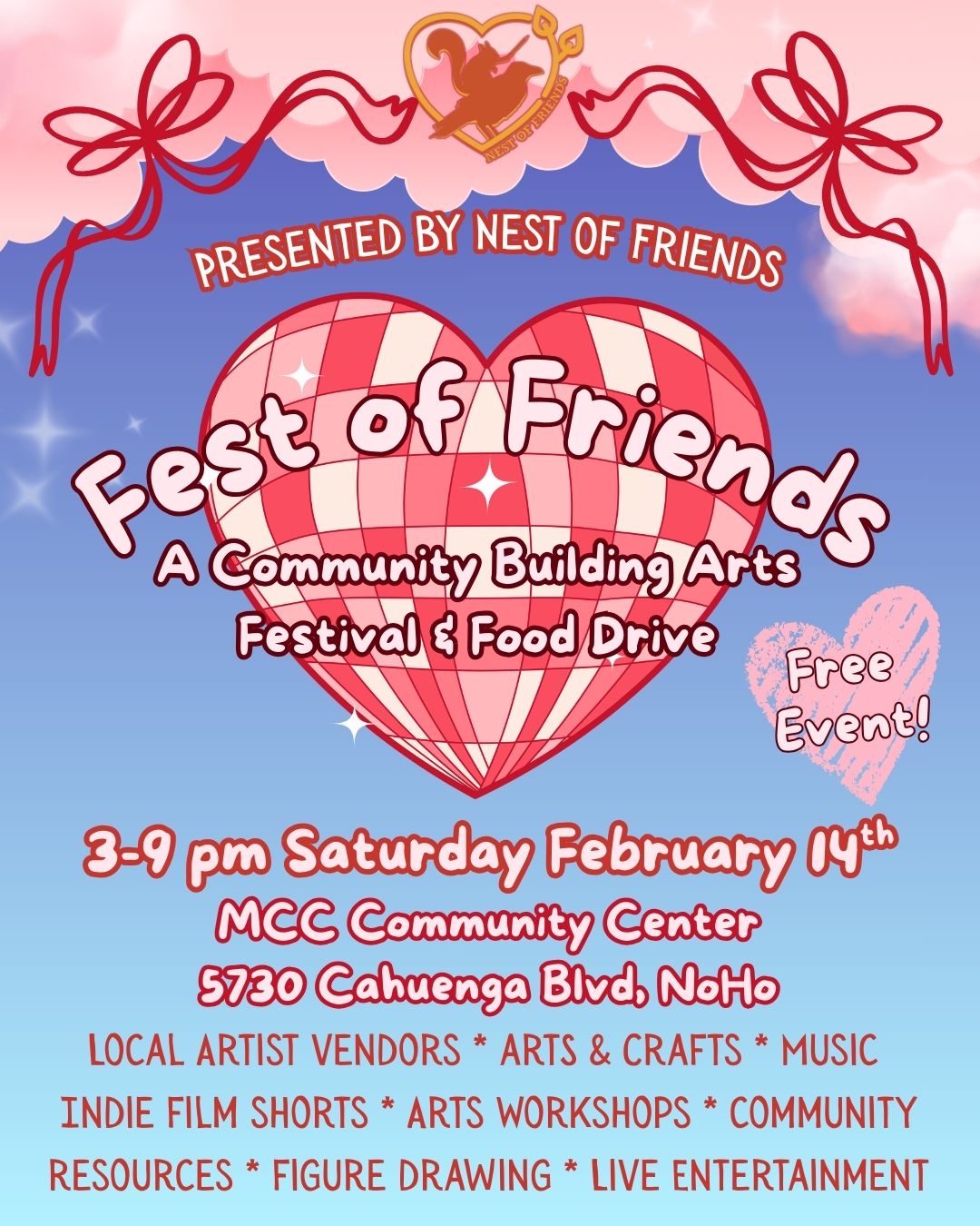 Feb 14, 2026 3:00 PM (PST) → Feb 14, 2026 9:00 PM (PST) | Sat, Feb 14 • 3:00 PM–9:00 PM | Sat, Feb 14, 2026 | Community arts festival and food drive. | North Hollywood | Free | 5730 Cahuenga Boulevard Los Angeles, CA 91601 | admin@nestoffriends.org | A Community Building Arts Festival & Food Drive at MCC Community Center in North Hollywood. The theme of the event is Love Your Neighbor. Admission is FREE and the event will include: Local artist & artisan vendors, music & live entertainment, short films by local indie filmmakers, arts & skill sharing workshops, live figure drawing, community resources, arts & crafts and more! Guests are encouraged to bring non-perishable food items or make a monetary donation to MCC's food pantry serving the local San Fernando Valley community. | Jan 31, 2026 12:45 AM | |||||