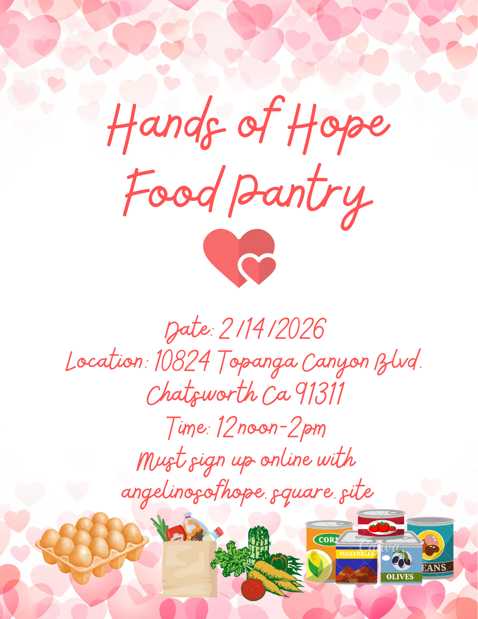 Feb 14, 2026 12:00 PM (PST) → Feb 14, 2026 2:00 PM (PST) | Sat, Feb 14 • 12:00 PM–2:00 PM | Free groceries for those in need! | Chatsworth | Free | 10824 Topanga Canyon Boulevard in Chatsworth, CA 91311 | angelinosofhope@gmail.com | Free groceries for those in need! Please register on her website. | Jan 10, 2026 2:29 AM | ||||||