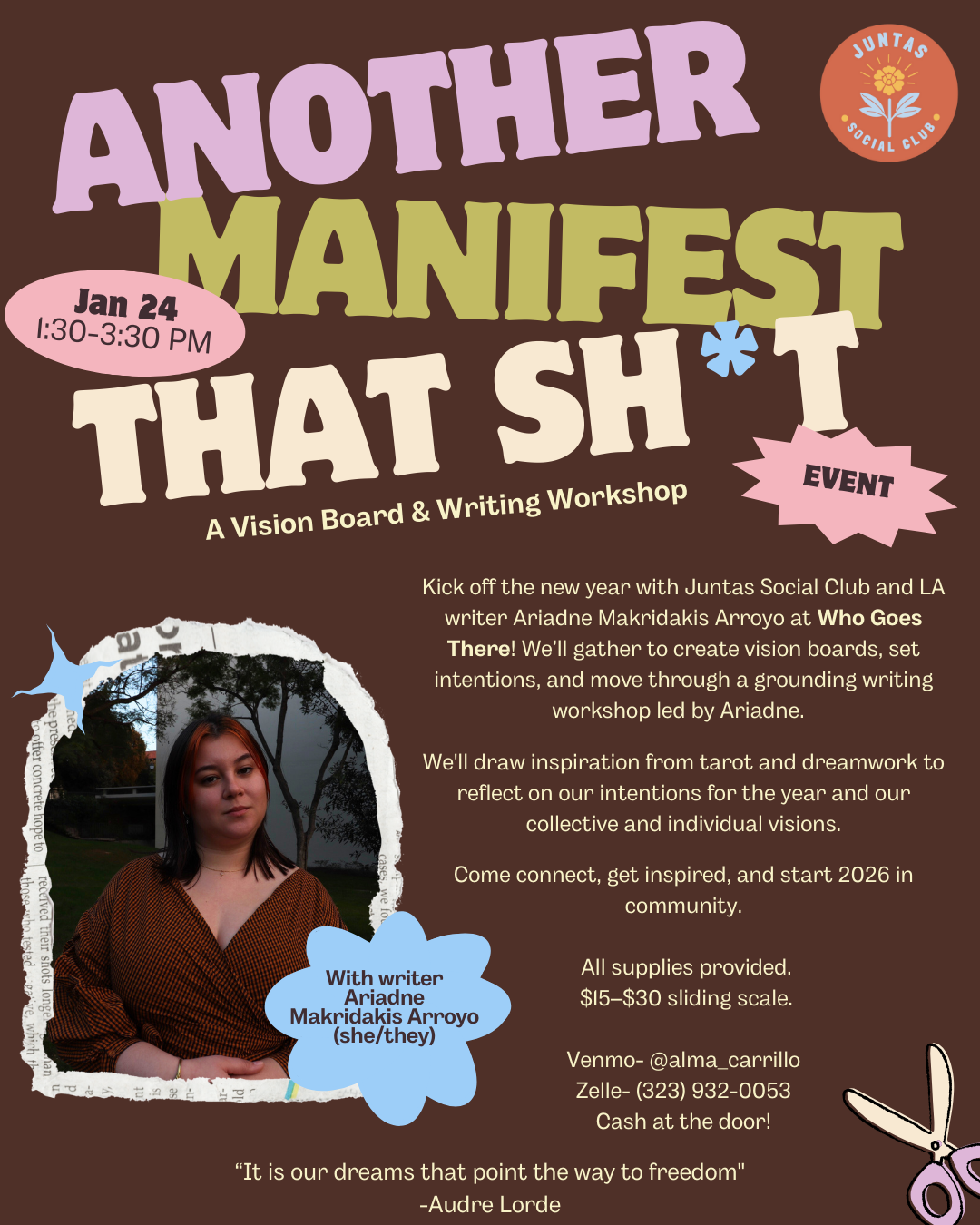 Jan 24, 2026 1:30 PM (PST) → Jan 24, 2026 3:30 PM (PST) | Sat, Jan 24 • 1:30 PM–3:30 PM | Create vision boards and participate in a writing workshop. | Sherman Oaks | $15-$30 sliding scale | 13737 Ventura Blvd, Sherman Oaks, CA 91423 | juntassocialclub@gmail.com | Kick off the new year with Juntas Social Club and LA writer Ariadne Makridakis Arroyo at Who Goes There! We’ll gather to create vision boards, set intentions, and move through a grounding writing workshop led by Ariadne. Come connect, get inspired, and start 2026 in community. All supplies provided! | Jan 9, 2026 3:07 AM | ||||||