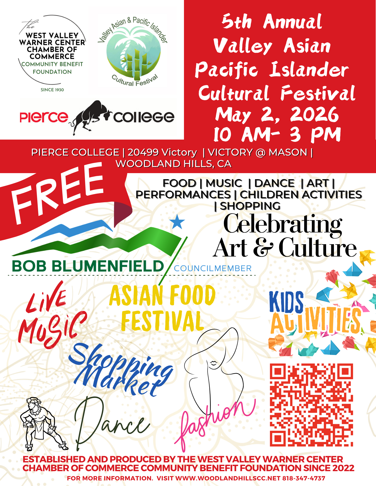 The 5th Annual West Valley Warner Center Chamber of Commerce Valley Asian Cultural Fest is a vibrant celebration of culture and community. Attendees can enjoy live performances, delicious food from various vendors, and local exhibitors showcasing unique items. There will also be raffles and fun activities for kids, making it a great day for everyone.