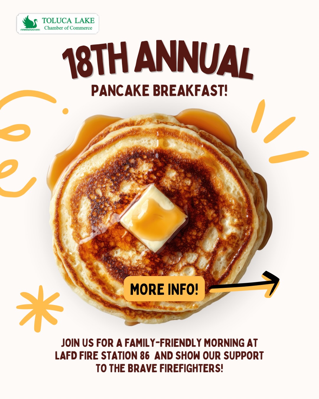 The Annual Toluca Lake Pancake Breakfast is a family-friendly event featuring all-you-can-eat pancakes, eggs, sausage, fruit, and drinks. Thereβs a kidβs zone, photo opportunities with Sparky, and tours of the fire station. Proceeds from the event support local firefighters and their families, making it a meaningful community tradition.