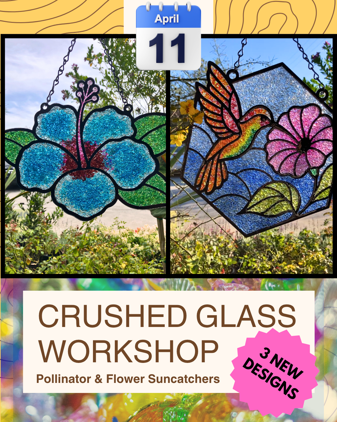 This workshop offers a creative opportunity to make stunning acrylic suncatchers inspired by bees, butterflies, and hummingbirds using vibrant crushed glass and UV resin. Perfect for both beginners and experienced crafters, all materials are provided. It promises a relaxed atmosphere where creativity can flourish while celebrating the beauty of spring and the vital role of pollinators.