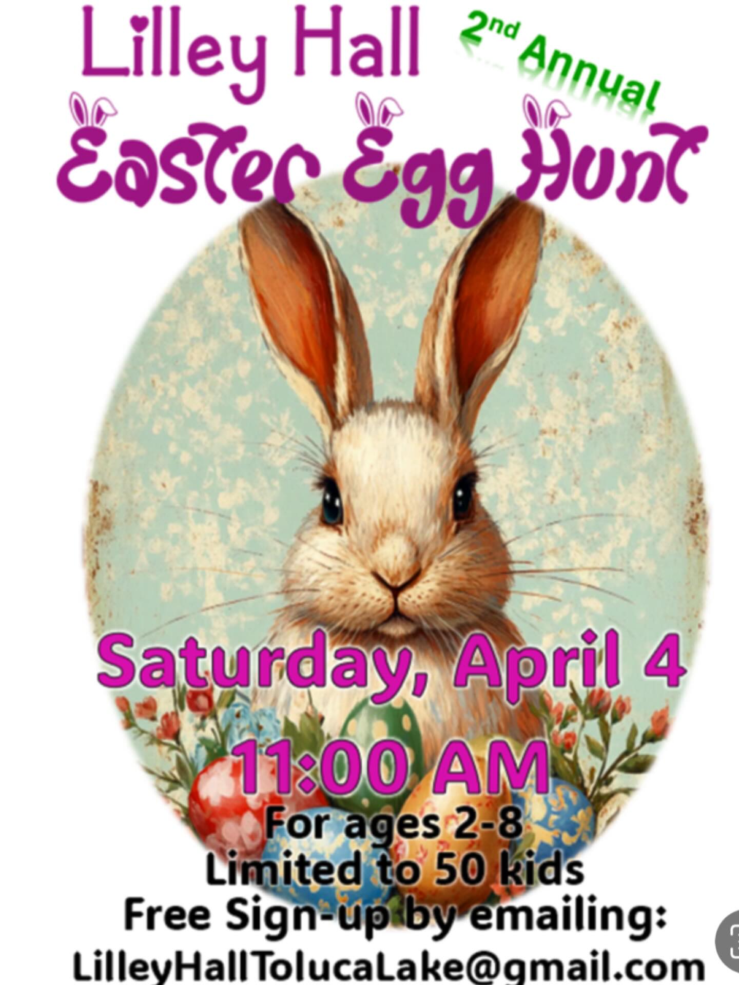 The Lilley Hall Easter Egg Hunt is back for its second year. It's a fun event for kids ages 2 to 8, with space limited to the first 50 children. Attendees can RSVP by emailing their details to secure a spot for the hunt.