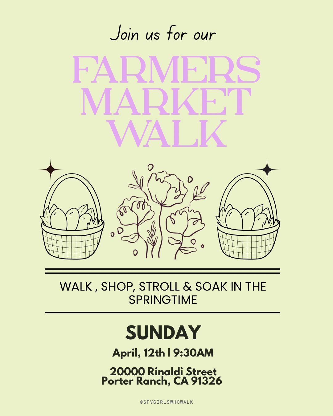 A relaxing Sunday morning walk is planned at the Porter Ranch Farmers Market. It's a great chance to enjoy fresh air, connect with friendly faces, and explore the market together. Comfortable shoes and a tote for goodies are recommended for a fun and easygoing experience.