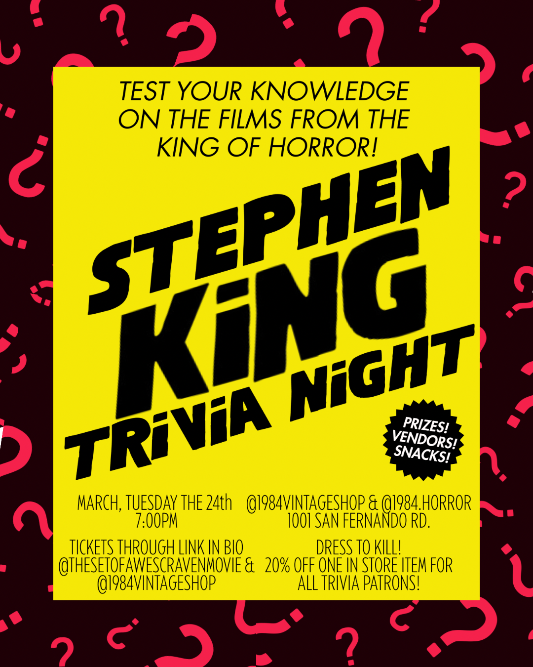 Get ready to test your knowledge of Stephen King's films at a fun trivia night. Located inside a vintage shop, this event features prizes, vendors, and a chance to dress as your favorite character for a free gift while supplies last. It's a great way to celebrate the King of Horror with fellow fans.