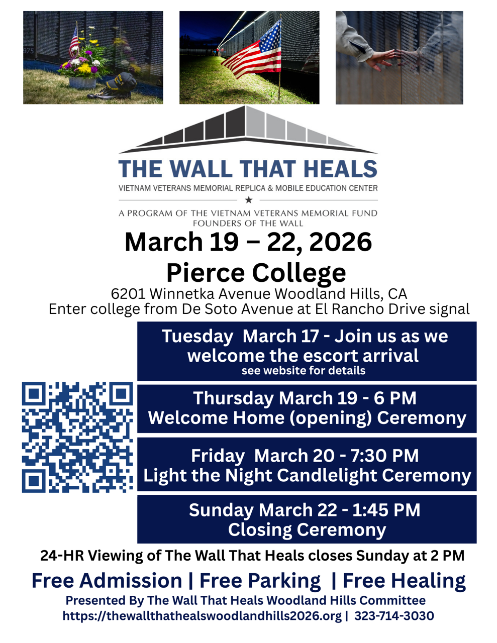 The Wall That Heals is making its debut in Woodland Hills, featuring a three-quarter scale replica of the Vietnam Veterans Memorial. This traveling exhibit honors the 58,281 men and women who lost their lives in the Vietnam War. Visitors can walk alongside the Wall, reflect on the names etched in it, and pay tribute to the nation's heroes. Along with the Wall, thereβs a Mobile Education Center that shares stories of service and sacrifice, highlighting the impact of the Vietnam War on veterans and their families. This event offers a meaningful opportunity for reflection and learning in the community.